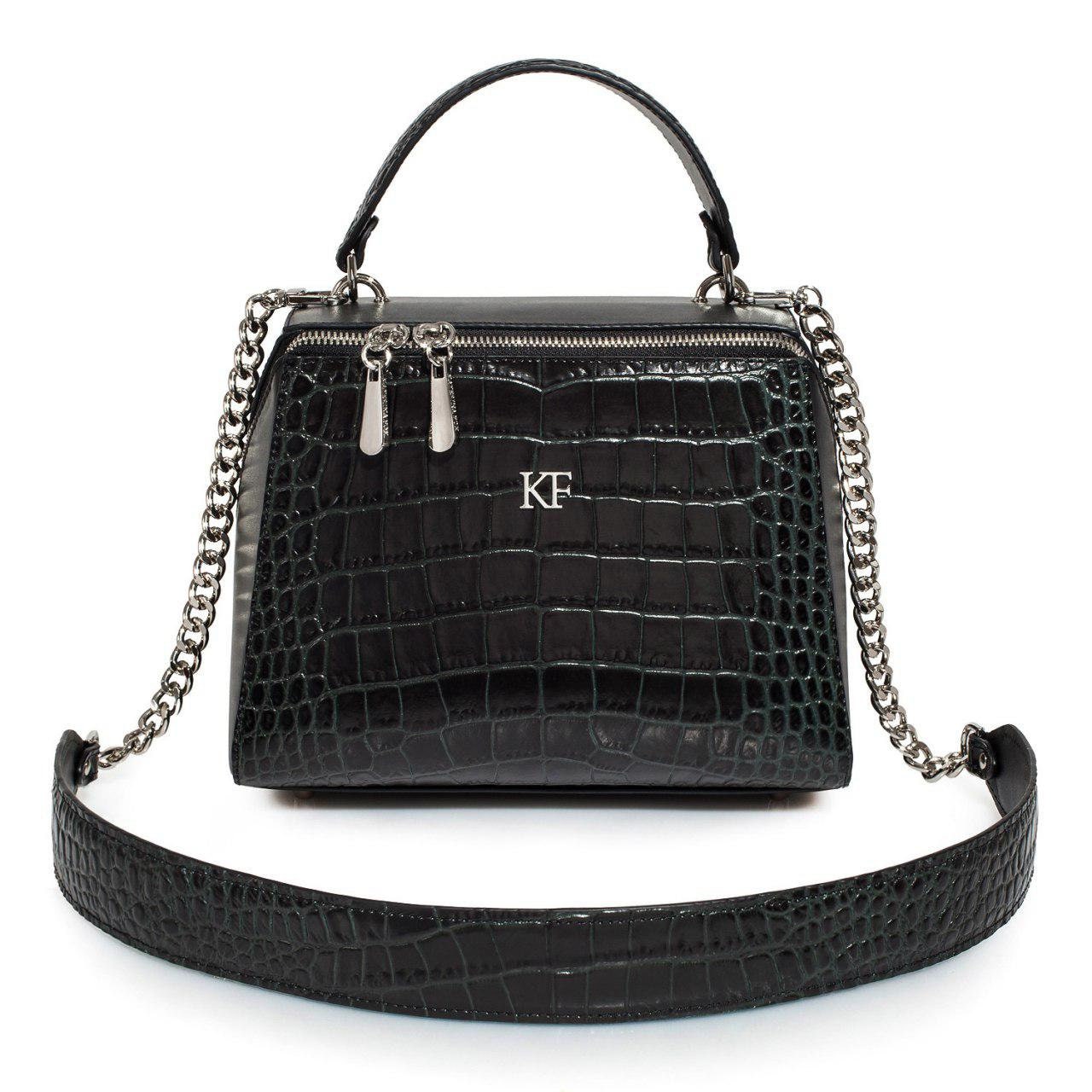 Black genuine leather handbag from ukrainian designer Katerina Fox. The internal space of a bag is equipped with three spacious compartments and two patch-pockets and one zipper pocket. One of the spacious compartments is closed with a zipper. The bag is closed with a clasp. The bottom of the bag is protected with metal legs. There is a long handle that allows you to wear the bag on the shoulder. The kit also includes a storage bag.